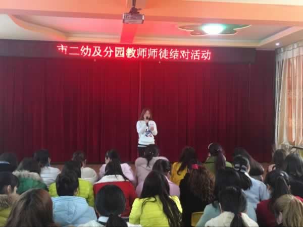 3月10日, 市二幼及分园教师“师徒结对”活动在多功能厅举行。整个活动分为拜师仪式、师傅代表讲话、徒弟代表讲话和副园长李勤致辞四个部分。