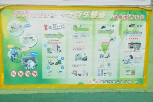 市二幼专门用横幅张贴,做好宣传除四害的方法,提高对“四害”传播疾病危害的认识和自我防范意识,动员广大教职工参与灭四害专项活动。重点对幼儿园的垃圾筒、下水道口、楼道、卫生死角进行排查,彻底清除积存的垃圾,并喷洒杀虫喷雾剂、灭蟑螂剂,清除四害及孳生物,还放上老鼠笼、捕蝇笼,将灭四害工作真正落到了实处。