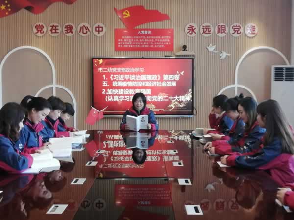 党支部纪检委员许金岚同志带领全体党员集中学习《习近平谈治国理政》第四卷之“统筹疫情防控和经济社会发展”、党的二十大报告、《中国共产党章程》。教育是国之大计、党之大计。许金岚同志寄语全体党员要把思想教育放在第一位,加幼儿思想道德建设,加强意识形式领域建设,通过幼儿园五大领域教学感知,通过潜移默化从小培养幼儿爱祖国、热爱制度、热爱优秀传统文化思想。她表示,习近平总书记在党的二十大报告中强调全党必须牢记“五个必由之路”,并且把“五个必由之路”上升到“我们在长期实践中得出的至关紧要的规律性认识”高度,作为青年党员,我们要深入贯彻习近平总书记重要讲话和重要指示精神,增强“四个意识”、坚定“四个自信”、做到“两个维护”,要坚定理想信念,勇担时代使命,发挥生力军和突击队作用,为党和国家事业贡献自己的青春力量。