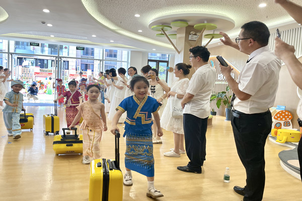 游戏是童年的回忆,是时光的缩影,在欢声笑语中,孩子们以班级为单位逐一打卡傣乡风情游戏点:竹竿舞、傣伞秀场、傣乡现代科技馆、扎染工作坊,享受着游戏带来的欢乐和美好时光,一旁陪伴的家长笑容满面地看着孩子,或轻声提示,或持手机定格萌娃快乐瞬间。