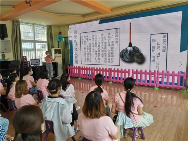 为提高全体教职工师德师风水平,进一步推动学校精神文明建设,8月23日下午,市二幼开展了“学习最美教师 弘扬优良师德”道德讲堂活动。 活动在主持人的带领下,全体教师在音乐声中自省,齐唱《我和我的祖国》;观看最美教师张桂梅的感人事迹,感受张老师以崇高的师爱谱写了人间最动人的乐章;老师们纷纷表达自己的感悟:作为教师,不一定要惊天动地、轰轰烈烈,而贵在平平凡凡中教书育人,传递正能量。用一颗爱教育、爱幼儿的真诚之心春风化雨。诵一段经典:“爱人者,人恒爱之;敬人者,人恒敬之”, 经典的力量不仅仅在于精神层面的提升,更在于行动层面的实践;最后园长送祝福:希望老师们忠诚人民教育事业,依法履行教师职责;为人师表,敬业爱生;严谨治学,修身立德;因材施教,启智求真,恪守有教无类。 本次道德讲堂活动,震撼着教师的心灵,陶冶着教师的情操,也带给他们深刻的思考,引领教师今后在平凡的岗位上继续发挥着不平凡的作用,让教师们能够在自己的教育工作中坚守道德的底线,提升道德境界,真正做到“以德育人”。(杨倩倩)