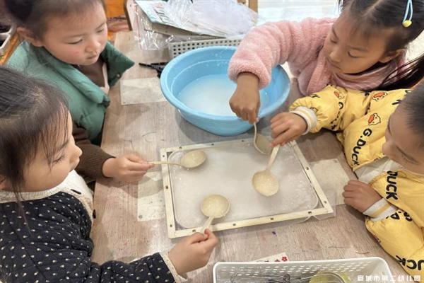 在探索书籍的演变过程中,孩子们对书中的纸张的兴趣越来越大。在讨论过程中,孩子们觉得自己也可以动手制作呀!于是他们拿起废纸、水盆、湿布、细筛网、笔、木棒等工具开始制作纸浆,让我们一起来看一看吧!