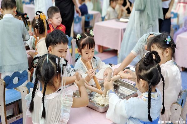 华夏霓裳,汉服之美。汉服不仅仅是一套服装,更是一种文化象征。市二幼西林园区中大班的幼儿、老师都穿上汉服,展示中华服饰之美。在这团圆温馨的节日氛围里,教师节目《舞龙》拉开了活动的序幕。老师在轻松愉悦的谈聊中让幼儿知道了中秋的来历和习俗。明月寄相思,千里传真情。孩子们通过歌表演《月儿圆》《爷爷为我打月饼》等,来演绎节日的欢快景象,感受浓浓的节日氛围。幼儿手工团扇、月亮灯、古法糍粑环节勾起了孩子们无尽的遐想,孩子们独具匠心的小制作给中秋节点缀上了别样的风采。蹴鞠球等多种传统游戏深深吸引了幼儿的参与,加深了他们对中秋节的认识和对团圆、分享、喜爱等情感的体验。