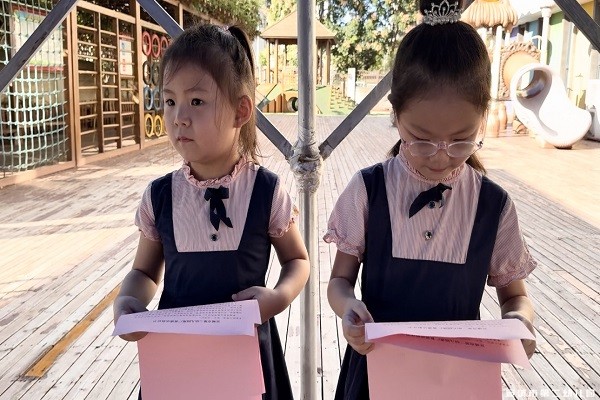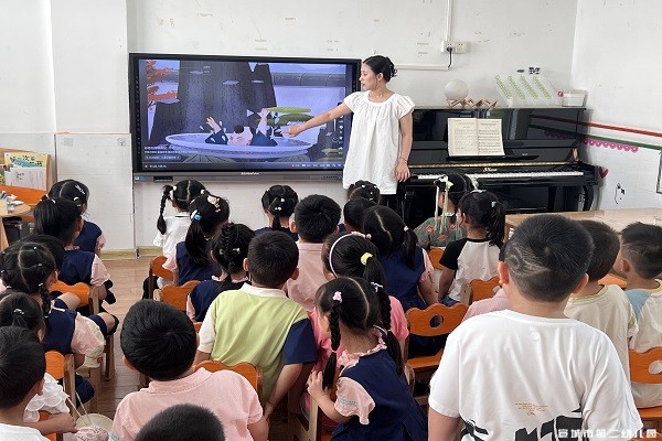 “在东方,大写的方块字里,让我们和世界一起读中国……”在优美的音乐中,教师和幼儿共同用普通话齐颂诗歌,一起感受诗歌里优美的词语所带来的美好,体会中国独有的大气磅礴。