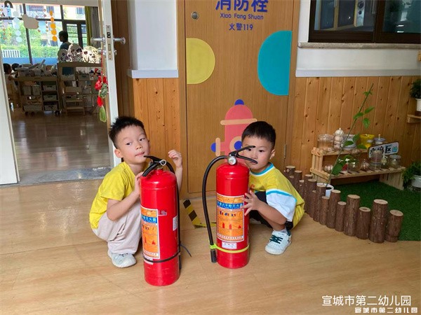 大班的孩子们除了教师开展的安全集中教育活动,还开展了具有实践意义的安全活动。如老师带领幼儿认识消防器材,讲解灭火器的使用方法和安全通道的具体位置。