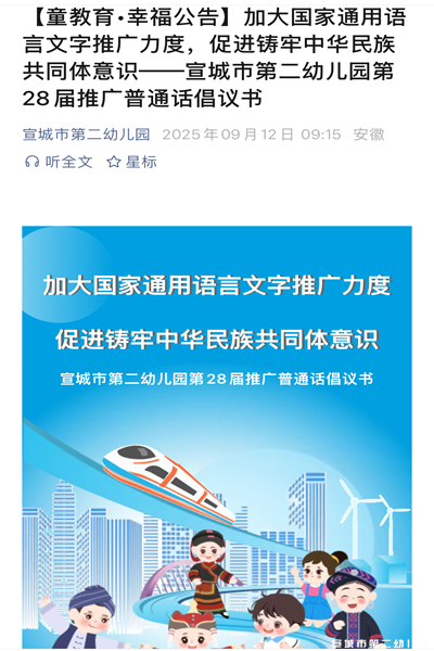 本届推普周活动虽已圆满落幕,但推广普通话的脚步不会停止。宣城市第二幼儿园将继续深化语言文字教育工作,将普通话推广融入日常保教活动中,让每一个孩子都能在优美的语言环境中成长,让普通话成为他们走向更广阔天地的桥梁。让我们携手同行,用普通话传递文明,用共同语凝聚民族心!(马颖)