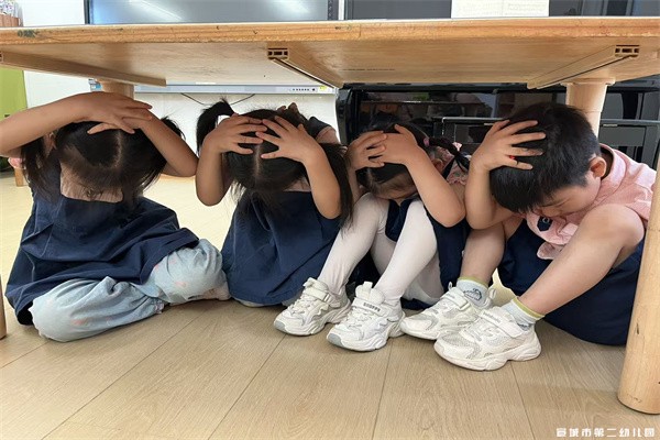 上午9点18分,随着第一声警报声响起,防空疏散演练正式开始。各班教师迅速组织幼儿做好疏散准备,孩子们就近蹲在桌子下、墙角或洗手间等空间狭小但墙体坚固处。楼层疏散引导员也迅速就位,准备指挥幼儿有序疏散。幼儿和教职员工全部撤离到户外安全地带后,老师们立即清点、核对幼儿人数,确保每一名幼儿的安全,并迅速向总指挥报告总人数。